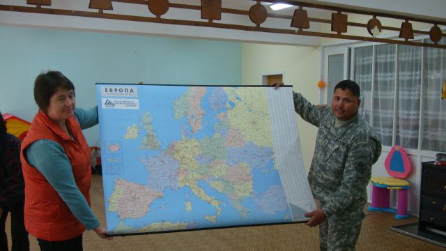 Приятна изненада поднесоха днес представители на американската армия от полигона Ново село на ЦДГ"Синчец" Зимница. Майор Салседо, зам.командир на базата в ново село лично поднесе на директора Мария Димитрова комплект блокчета за рисуване, водни бои, пастели, фулмастери, моливи, както и две географски карти- на Европа и на България. Дарението е закупено със специално събраните лични средства от американските военнослужещи, които решили по този начин да зарадват своите малки приятели от Зимница. Идеята дошла още по време на откриване ремонтираната сграда на детската градина, когато НАТО-вци по свой проект обновиха едно от помещенията. Сега заявиха готовността си да продължат съвместната добра работа със Зимница и община Стралджа. Според г-жа Димитрова подаръците идват съвсем навреме и ще доставят очакваната радост на малчуганите, които още утре ще могат да използват подарените бои и блокчета. |