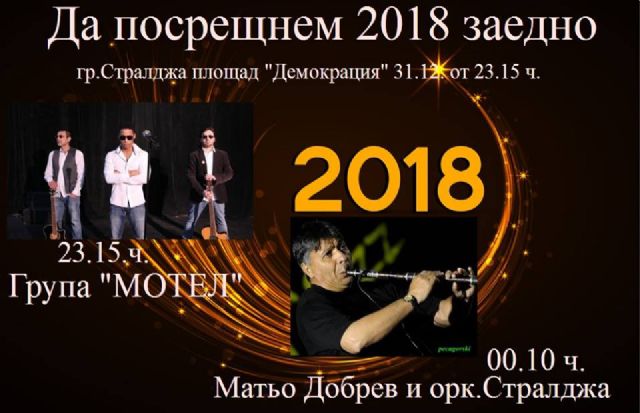 Да посрещнем 2018 година заедно на площада в Стралджа! От 23.15 стартират момчетата от група "Мотел" , които ще ни понесат из дебрите на българската поп музика и ще ни припомнят някои от най-хубавите български песни. В 23,55 е словото на Атанас Киров - кмет на Община Стралджа. Заедно с него ще преброим оставащите мигове до 2018. Зарята, която ще огрее Стралджа ще е от най-високо качество и визия, а народните хора ще започнат малко след полунощ с нашия съгражданин Матьо Добрев и оркестър Стралджа. Ще бъде различно и запомнящо се! Очакваме ви на площад "Демокрация" !