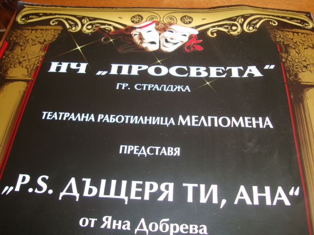 На 20 май от 19,30 ч. в салона на читалище "Просвета" за любителите на театъра самодейците от театралната работилница "Мелпомена"ще представят пиесата "P.S. Дъщеря ти, Ана" от Яна Добрева. Режисьор и постановчик е Димитър Стоянов, а между артистите зрителите ще разпознаят ветераните Георги Александров, Панайот Андонов, както и по-младото попълнение от Цветелина Тончева, Койчо Тончев, Валентина Златева, Добрин Енев, Желязка Георгиева. |